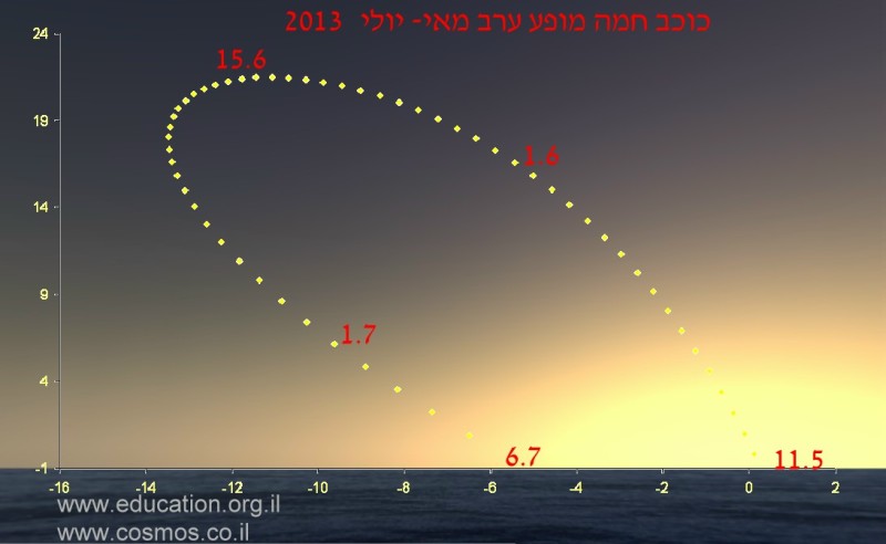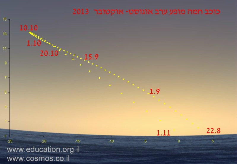 תאריכים נבחרים. המיקום של כוכב הלכת הוא ביחס לשמש בעת שקיעתה. בשנת 2013