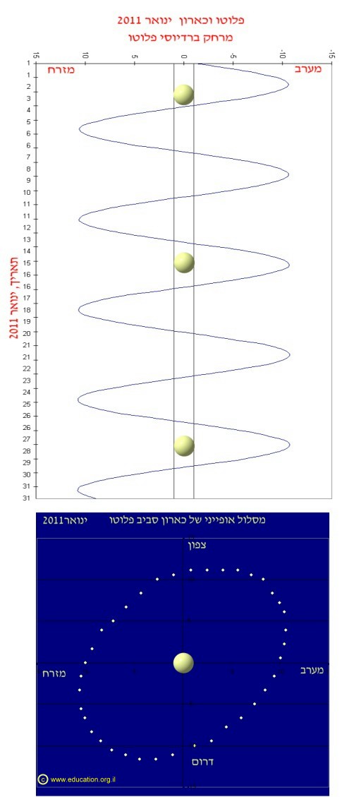 תצוגה גרפית של מסלול כארון סביב פלוטו, 2011 להלן התצוגה הגרפית של מסלולו של כארון סביב פלוטו. הנתונים הם עבור תחילת ינואר 2100. בדיאגרמה העליונ אפשר לראות את התנהגותו של כארון סביב פלוטו במונחים של הבדלים בקו אורך שמיימי. אולם, בשל ההיטל המעגלי הכמעט מעגלי של המסלול יש לקחת בחשבון את ההםרש בקווי הרוחב בין שני הגופים כפי שהם משתקפים בדיאגרמה התחתונה