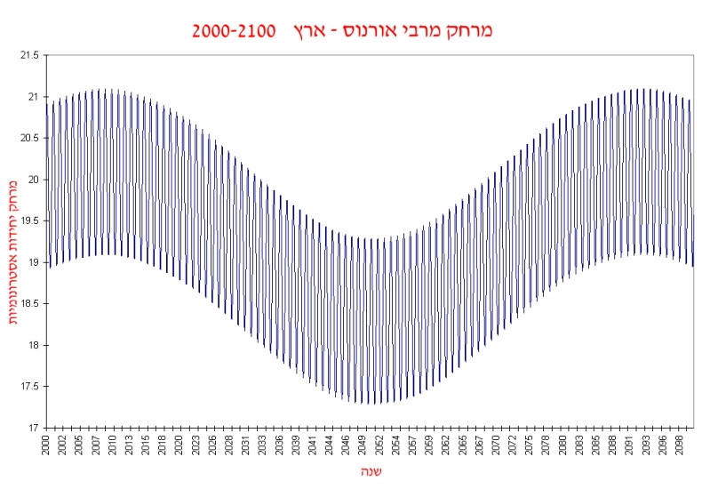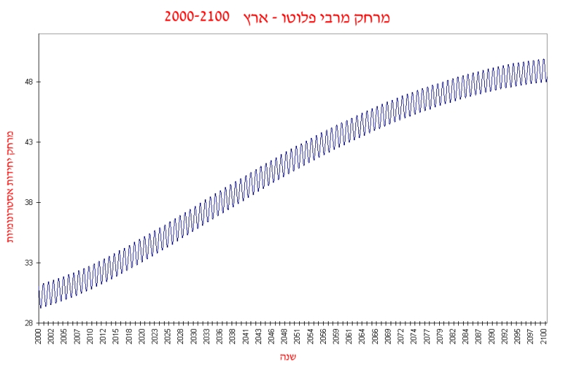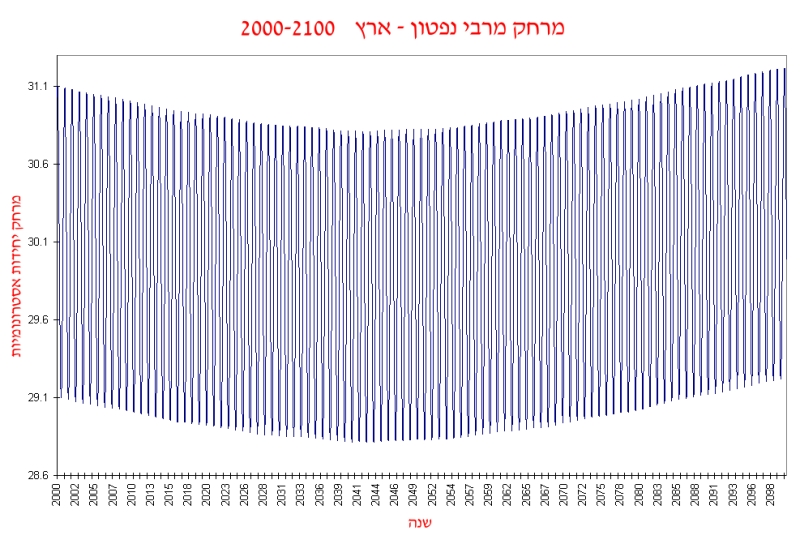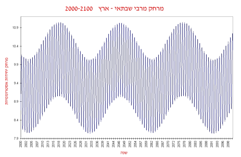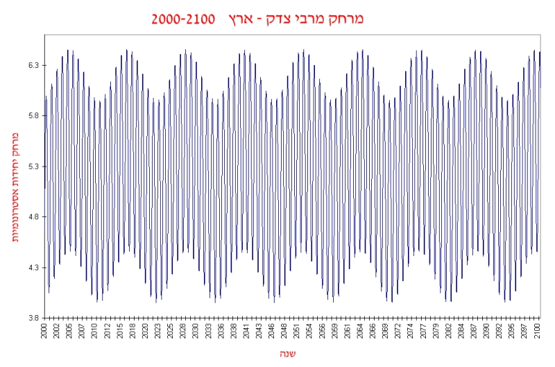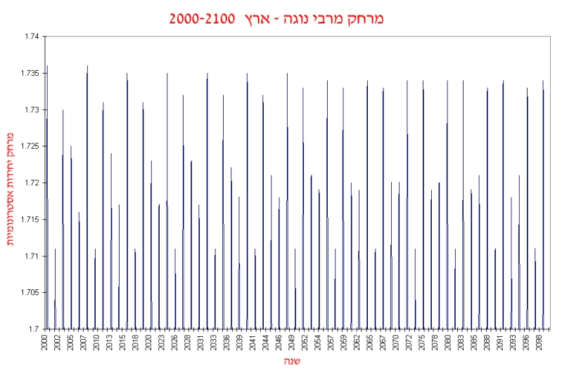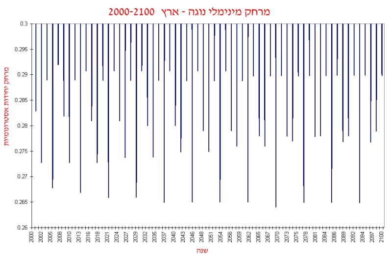 בגרפים אלה יובאו מרחקיהם של כוכבי הלכת מכדור הארץ במאה הנוכחית. הגרפים מתארים את השינוי במרחקי כוכבי הלכת המתבטאים בשינוי במרחק המינימלי והמקסימלי מכדור הארץ. שינויים אלה נובעים מהמסלולים האליפטיים של כוכבי הלכת וכדור הארץ בכללם סביב השמש. מחזוריות של ערכים מינימליים בעת מרחק מינימלי או מקסימלי בין כוכבי הלכת נובעת מכפולות שלמות של זמני המחזור של כוכבי הלכת וכדור הארץ. |