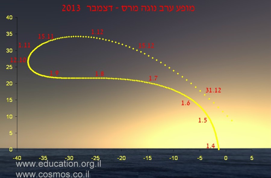 מופעי הערב של כוכב חמה מעל האופק המערבי. הציר האופקי מבטא את האזימוט ואילו